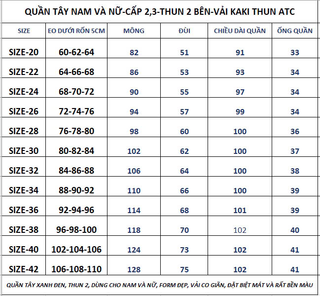 QUẦN TÂY NAM - THUN 2 BÊN - VẢI KAKI THUN ATC - Có Vòng Eo từ 60cm_110cm