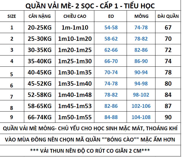 - Có 2 bảng size cho cấp 1, và cấp 2